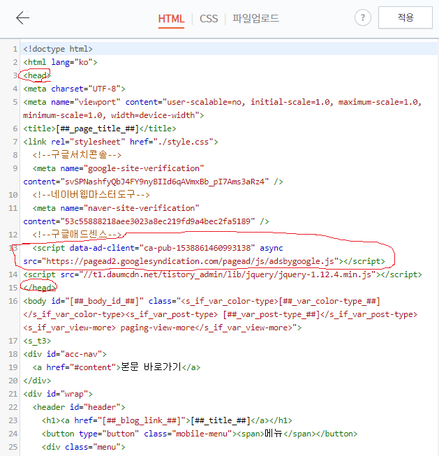 티스토리 관리 - 스킨 편집 - HTML 편집에 들어가셔서
