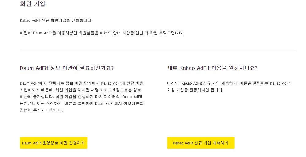 이런 화면이 뜹니다. 저는 다음애드핏을 사용하지 않았기 때문에 신규가입 계속하기를 눌렀습니다.
